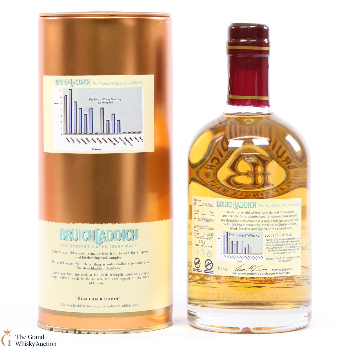 A 1990 vintage cask strength valinch in celebrating three Bruichladdich bottlings being blind-tasted and statistically analysed and found to zero ratings for undesirable impurities or off-flavours of any kind - the only three to do so of 350 whiskies tasted.
