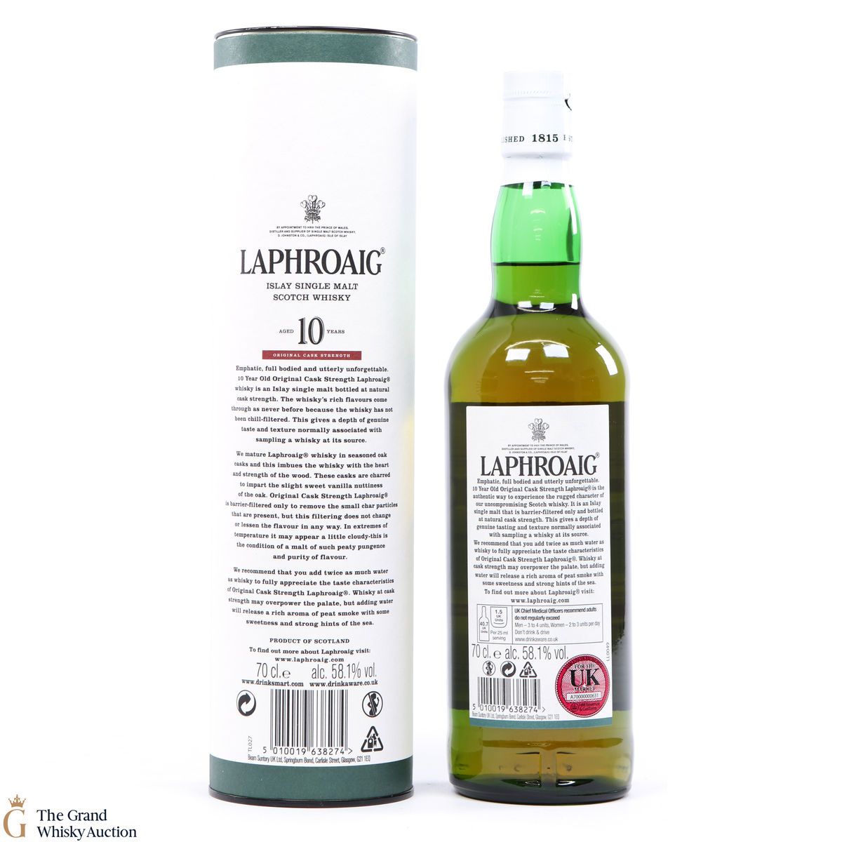 This bottling is from batch 009, original cask strength bottling of the medicinal 10-year-old from Islay's bestselling distillery, Laphroaig. In making Laphroaig, malted barley is dried over a peat fire. The smoke from this peat, found only on Islay, gives Laphroaig its particularly rich flavour. This release was bottled at 58.1% in February 2017.