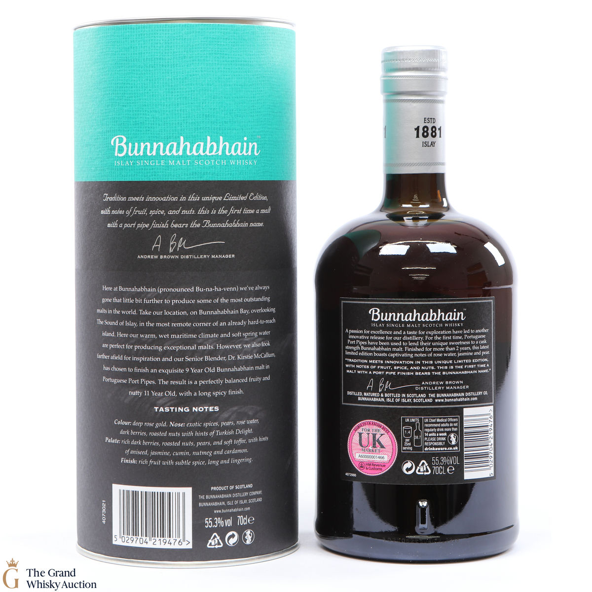 This Bunnahabhain limited release was distilled in 2007 and was aged in Warehouse 8 for 11 years. Initially matured in whisky refill hogshead casks and then filled into port pipes in 2016 for a final 2 years of maturation. It was bottled at 55.3% ABV. This is one of 1578 bottles produced.