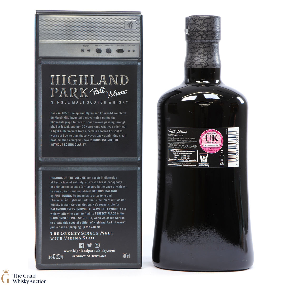 Full Volume by Highland Park was distilled in 1999 and bottled in 2017 from 481 casks. The single malt was matured exclusively in first-fill bourbon casks and was bottled at 47.2% ABV and comes presented in a themed presentation box resembling speaker.