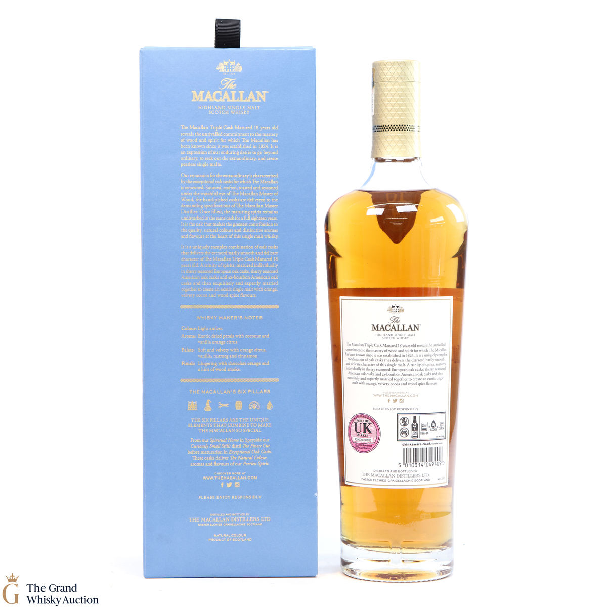 This 18 year old Macallan single malt was released in 2018 and sits is at the top of the Triple Cask range (which replaced the Fine Oak range). The whisky was matured in a combination of European sherry seasoned casks, American sherry seasoned casks and American ex-bourbon casks. This expression boasts bountiful notes of vanilla, dried fruit and woody spice.