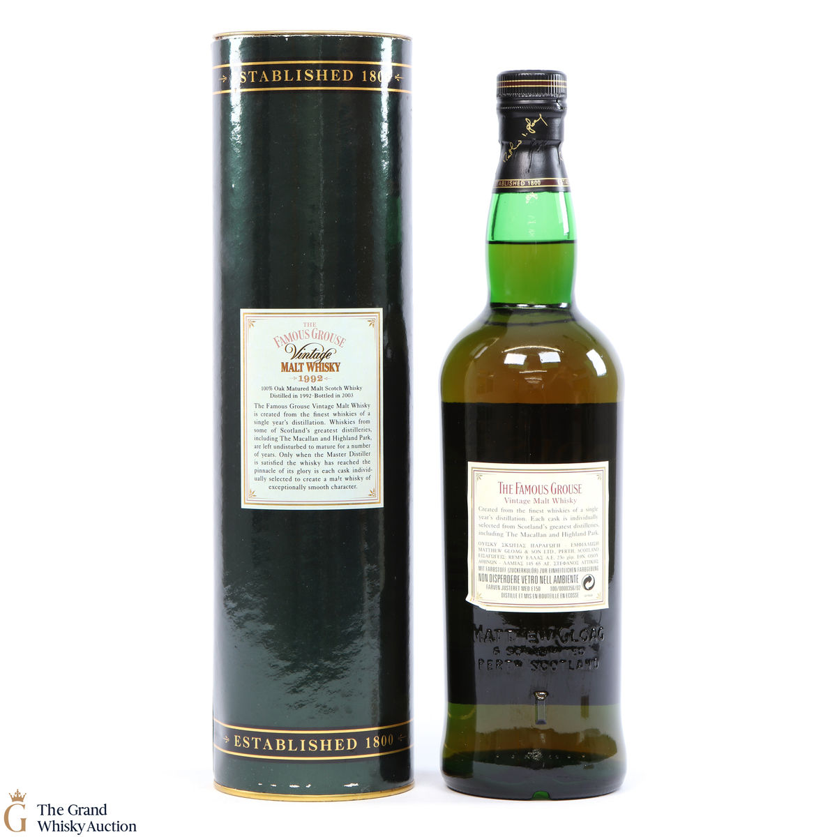 This is a litre bottling of Famous Grouse - 1992 Vintage, which was relased following the success of the 1989 vintage. This vatted malt from Famous Grouse includes Highland Park and Macallan.