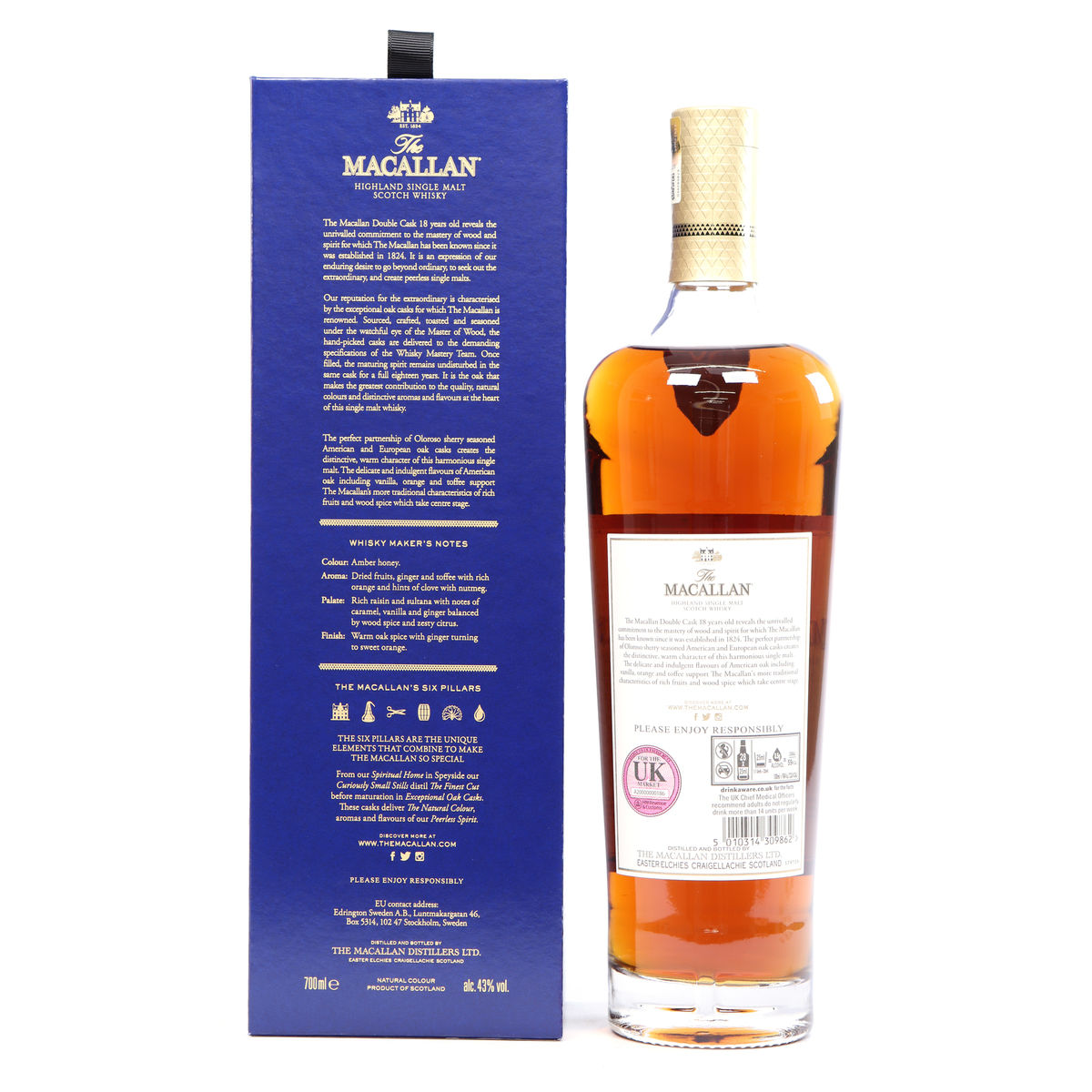 This 18 Year Old Macallan was matured in a combination of American and European Sherry oak for a minimum of 18 years. It is part of the Macallan Double Cask range, which marries the classic Macallan style and the sweetness of American oak.