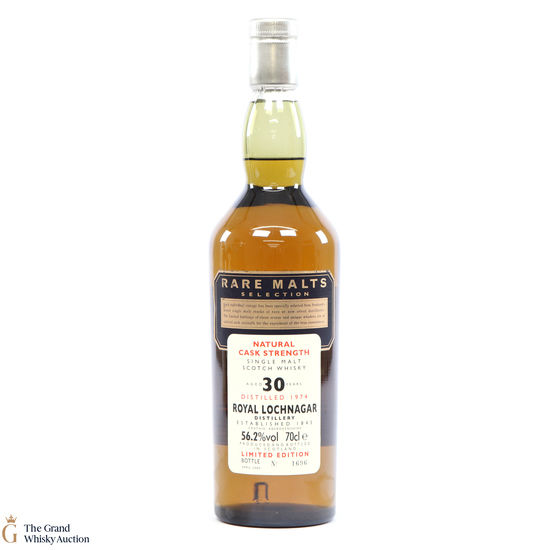 This Rare Malts Selection bottling of single malt whisky from the Royal Lochnagar distillery is highly collectable. It was distilled in 1974 and bottled 30 years later in 2004, and bottled at its cask strength of 56.2% ABV.