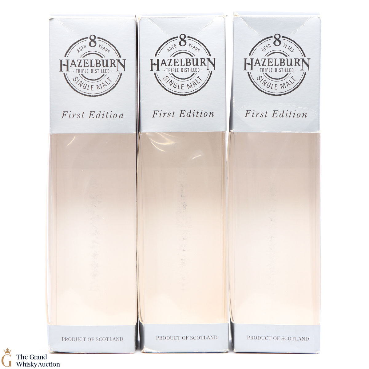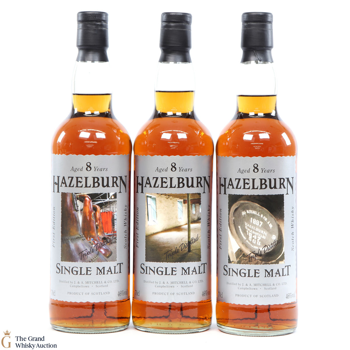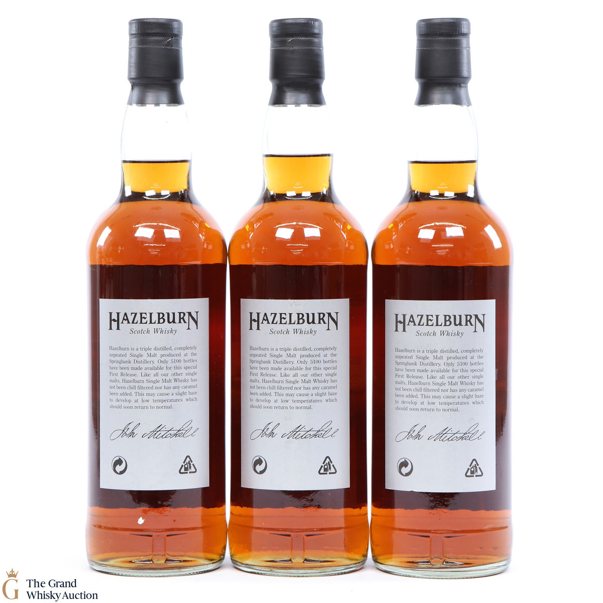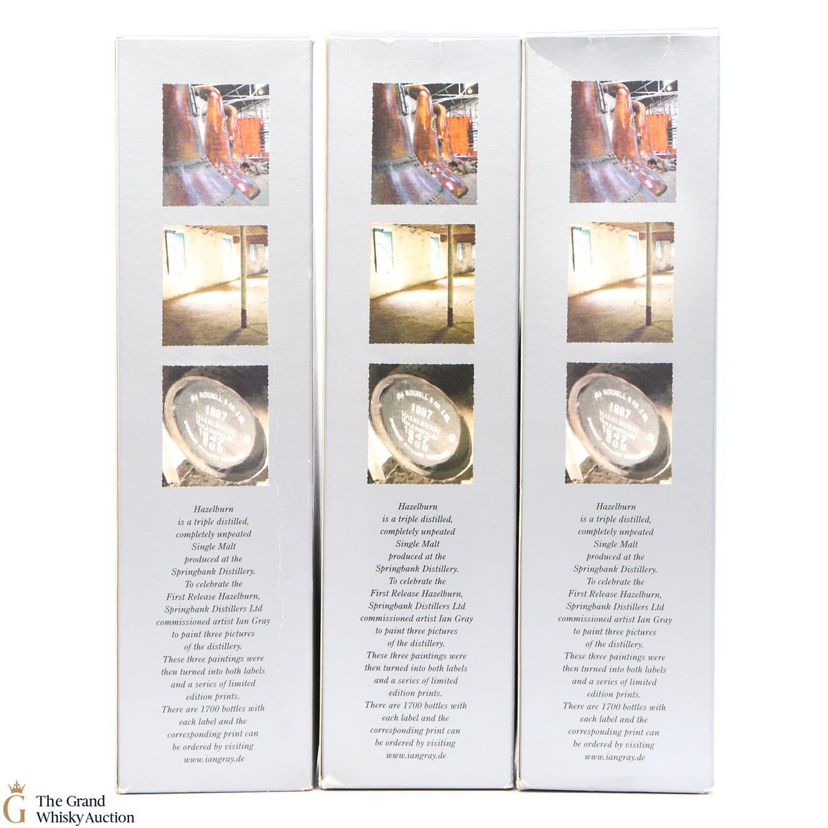 This lot has 3 x 70cl bottles of Hazelburn which is a triple distilled, completley unpeated single malt produced at Campeltown's Springbank Distillery. To celebrate the First Release Hazelburn, Springbank Distillers Ltd commissioned artist Ian Gray to paint 3 pictures of the distillery. These 3 paintings were then turned into both labels and a series of limited edition prints.