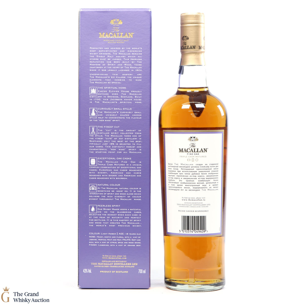 This 18 year old Macallan single malt was released in 2018 and sits is at the top of the Triple Cask range (which replaced the Fine Oak range). The whisky was matured in a combination of European sherry seasoned casks, American sherry seasoned casks and American ex-bourbon casks. This expression boasts bountiful notes of vanilla, dried fruit and woody spice.