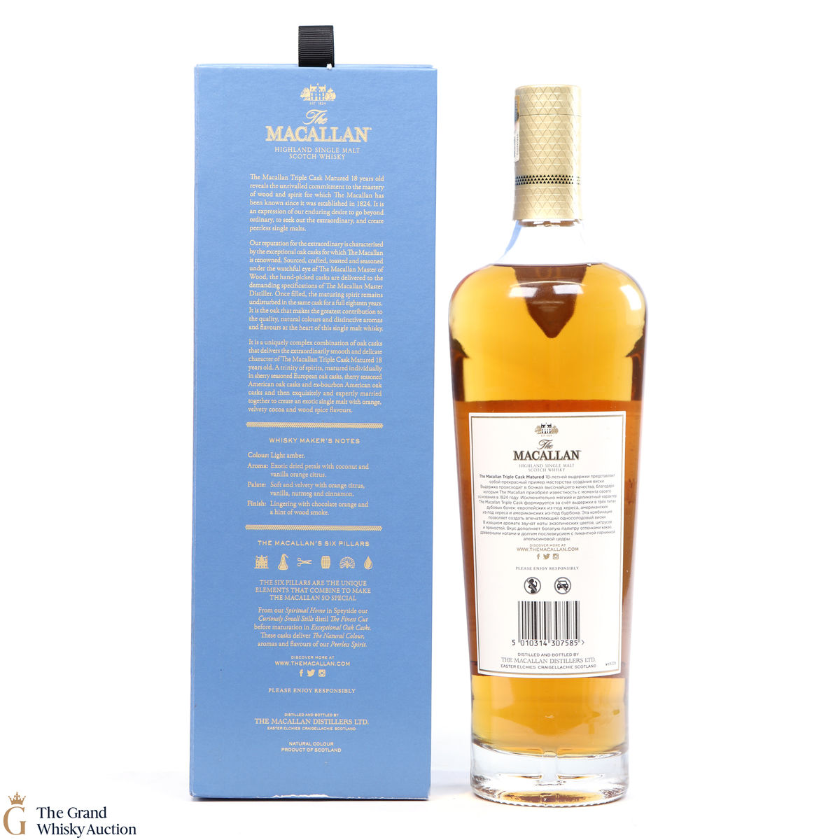 This 18 year old Macallan single malt was released in 2019 and sits is at the top of the Triple Cask range (which replaced the Fine Oak range). The whisky was matured in a combination of European sherry seasoned casks, American sherry seasoned casks and American ex-bourbon casks. This expression boasts bountiful notes of vanilla, dried fruit and woody spice.