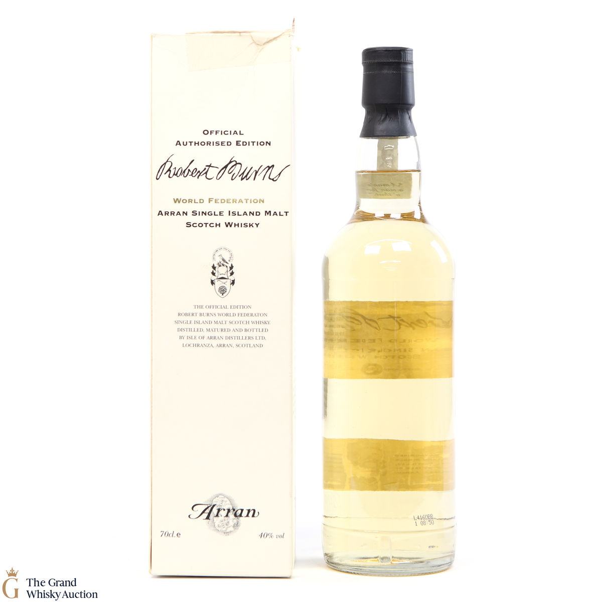 This 2001 bottling is limited edition from the Arran Distillery to mark the Patron of the Robert Burns World Federation Limited on the 25th January 2001. Registered number is 1763 which has been signed by the President J.H.Skilling and Chief Executive Shirley Bell.