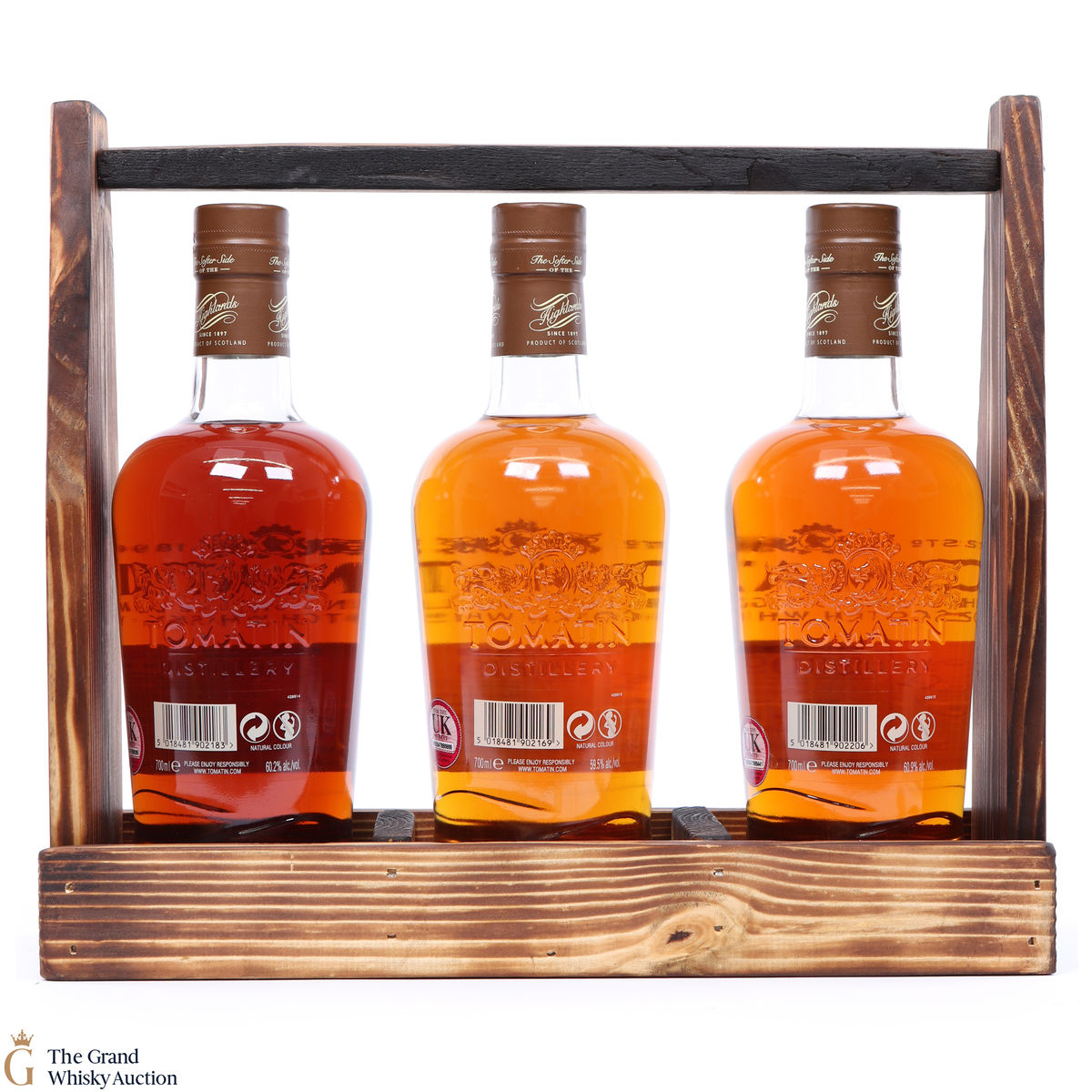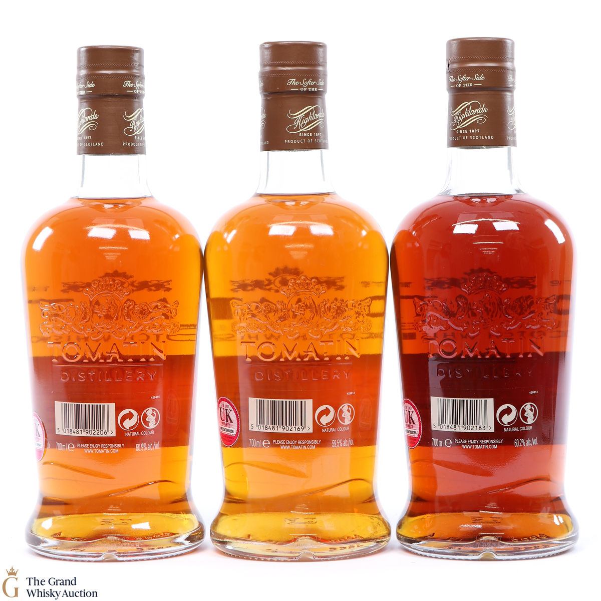 The Tomatin Verdejo Cask Trilogy is the result of a partnership between the Tomatin Distillery and the Aberdeen Whisky Shop. The three releases have been matured in different Verdejo Spanish white wine casks, which is a world first. They were all bottled at cask strength. This lot includes: