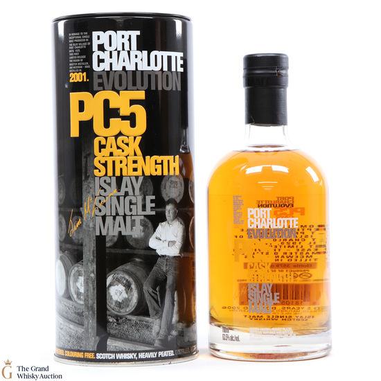 Port Charlotte PC5, produced by Bruichladdich Distillery, is a heavily peated spirit. It was the first release of heavily peated Port Charlotte and was produced in 2001 from some of the first spirits to be produced after the distillery's reopening. The single malt was bottled at 5 years old in 2006 and was limited to 6038 bottles.