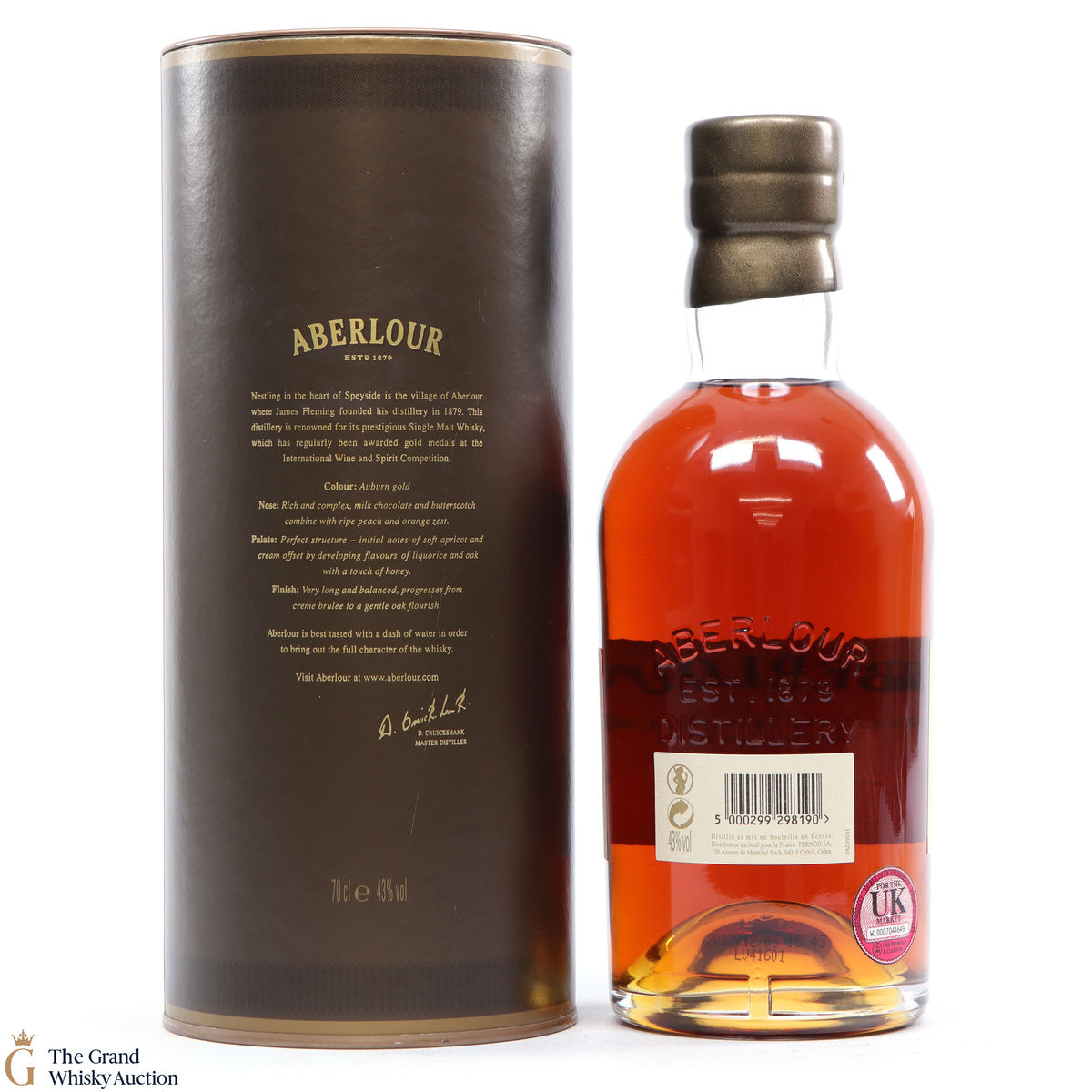Due to the various ages of bottles and their seals, the condition of liquid is at the buyer's discretion and no claim can be lodged against failure/leakage in transit. Loss and breakage cover is available at 3% of the hammer price as standard. If the lot is not insured, no claim can be lodged against the courier or The Grand Whisky Auction for breakage or loss in transit.