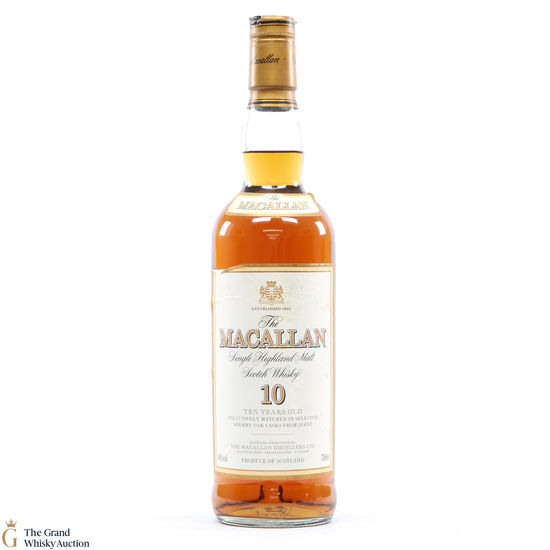 This is an old-style of Macallan 10 Year old was bottled in the 1990s. This classic Speyside malt whisky matured in sherry oak casks from Jerez. Very collectable.