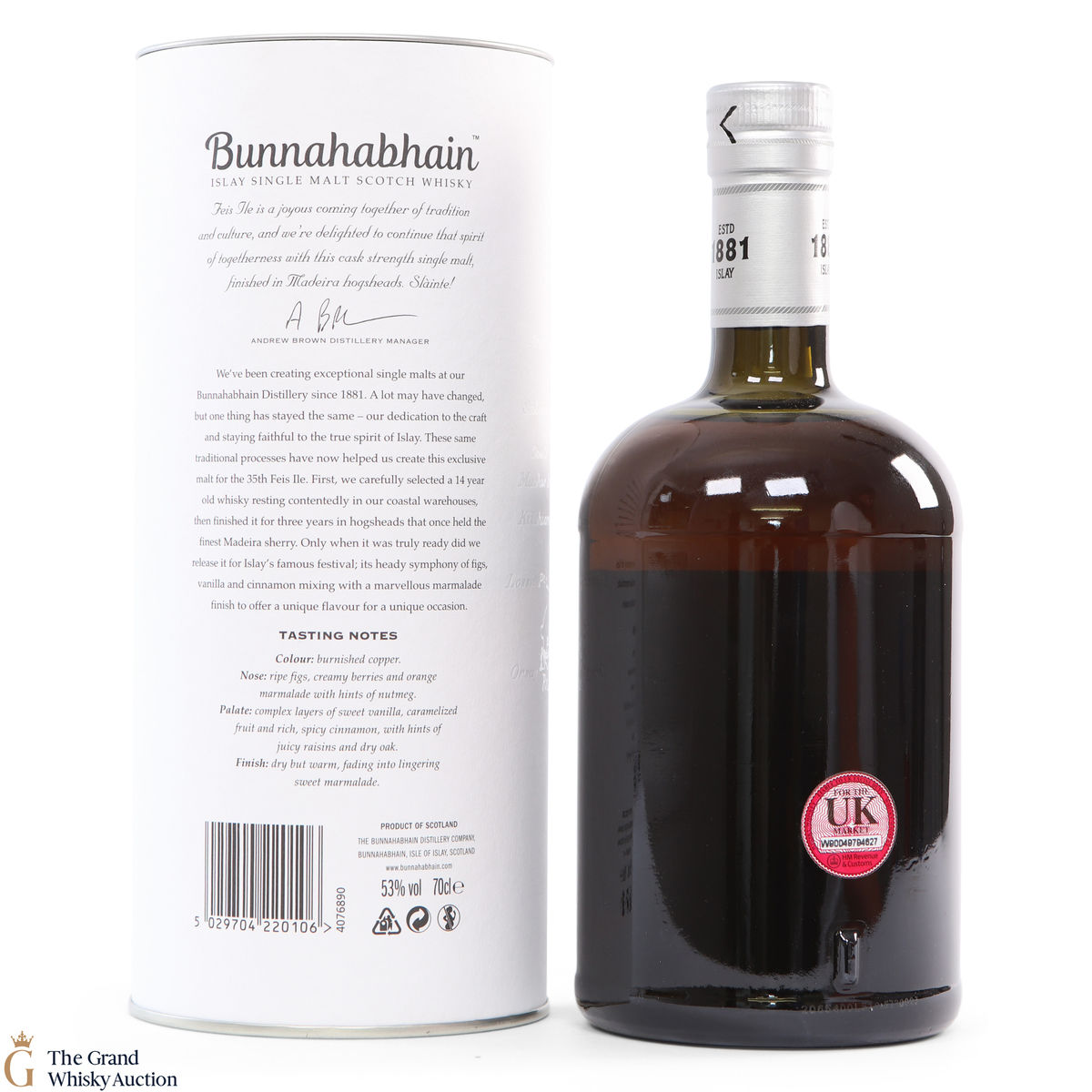 This limited edition single malt from Bunnahabhain Distillery was matured for 14 years in classic bourbon barrels, then finished in Maderia casks for another three years. Bottled at 53%, and released by Bunnahabhain for the 25th anniversary of Fèis Ìle - Fèis Ìle 2020. This is one of only 1164 bottles produced.