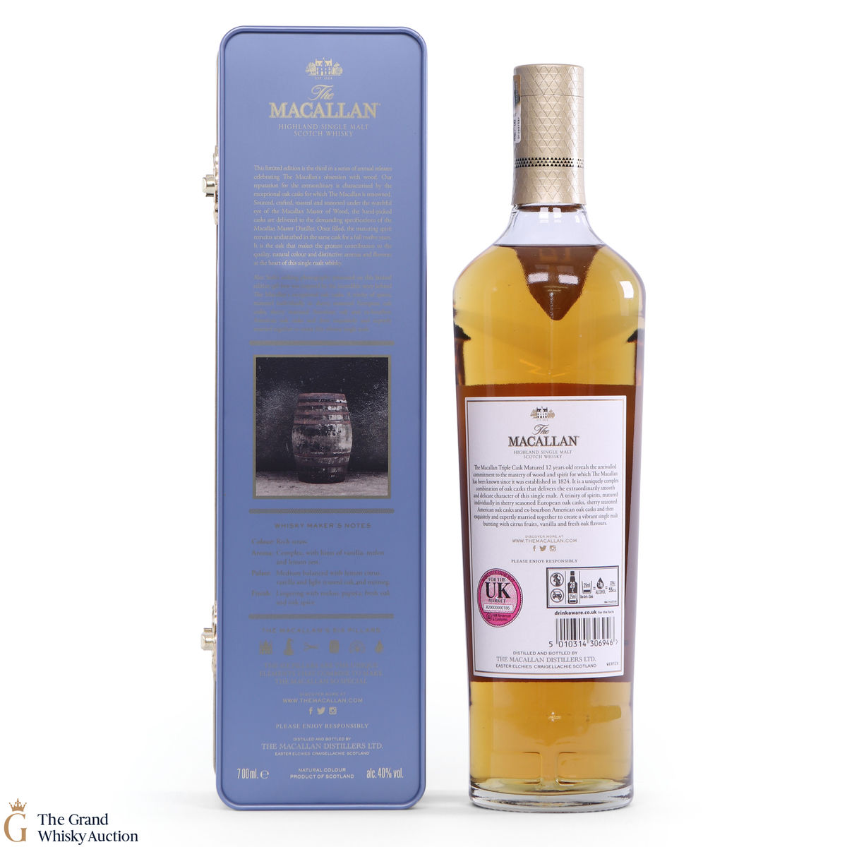 This Macallan 12 Year Old was Triple Cask matured in a mixture of European and American oak casks that have previously contained Sherry, as well as American oak casks which have contained Bourbon. It comes presented in a limited edition tin.