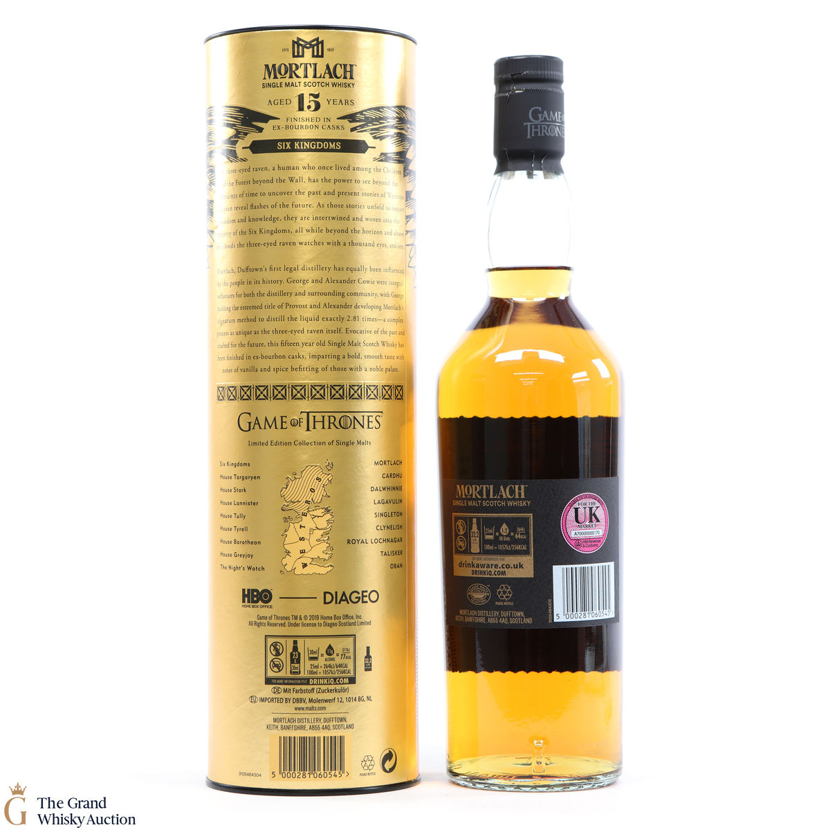 The final bottling in the Game of Thrones Single Malts Collection! The Six Kingdoms - a limited edition, 15-Year-Old Mortlach. Matured in first-fill sherry casks and finished in American oak bourbon casks. It comes in a presented in a metallic gold presentation tube, decorated with a pen and ink drawing of the mysterious three-eyed raven (aka Bran the Broken).