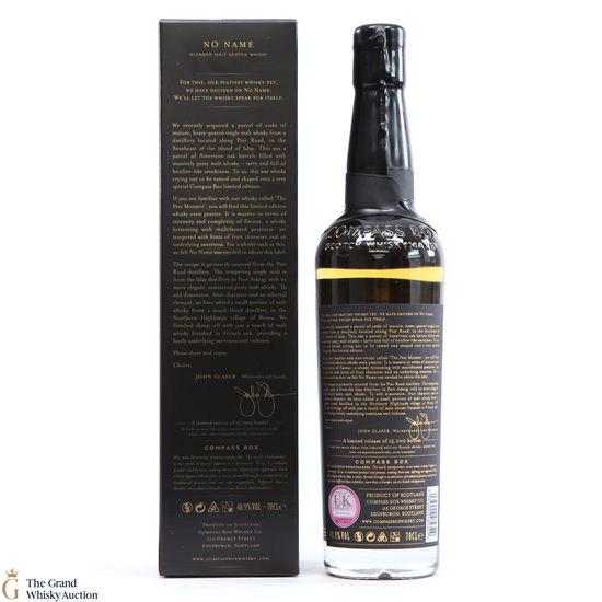 No Name is a limited edition blend by Compass Box, No Name released in 2017. This expression was said to be there peatiest whisky yet, made up with Ardbeg, and caol ila , as well as older malt Clynelish, matured in french oak casks.