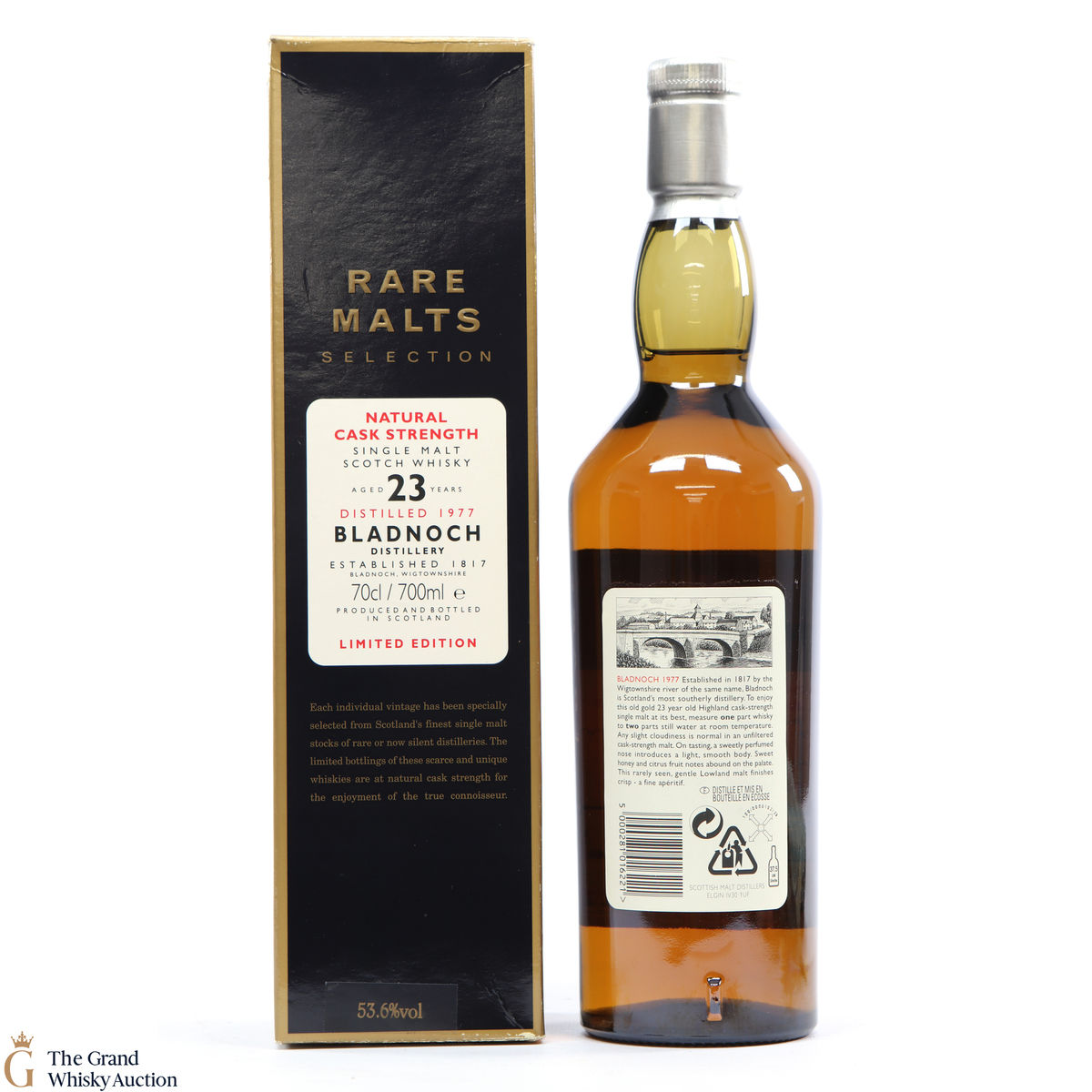 This Bladnoch 23 Year Old limited edition was bottled for the Rare Malts series. Distilled in 1977 this Lowland single malt was bottled at the natural cask strength of 53.6% in October 2001.