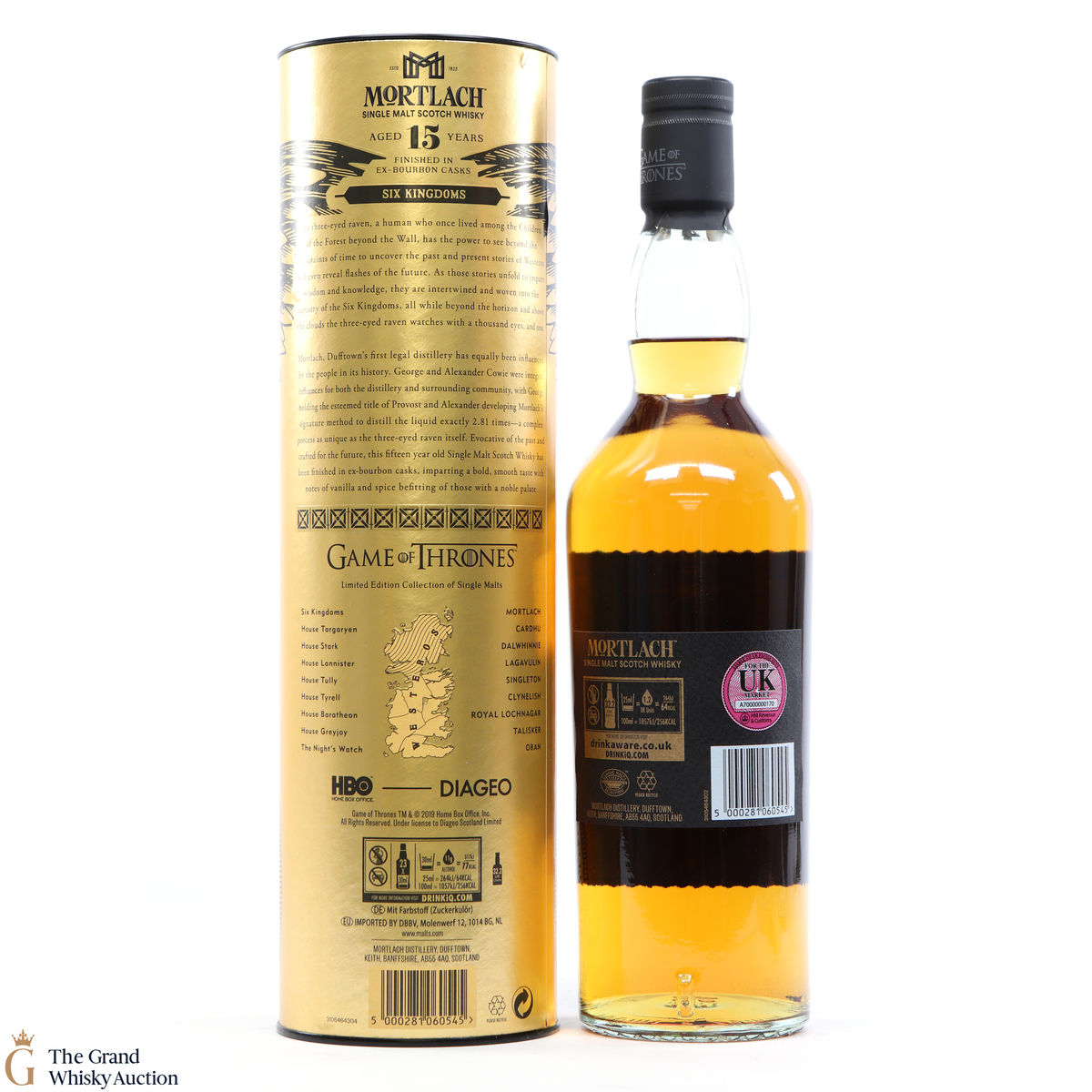 The final bottling in the Game of Thrones Single Malts Collection! The Six Kingdoms - a limited edition, 15-Year-Old Mortlach. Matured in first-fill sherry casks and finished in American oak bourbon casks. It comes in a presented in a metallic gold presentation tube, decorated with a pen and ink drawing of the mysterious three-eyed raven (aka Bran the Broken).