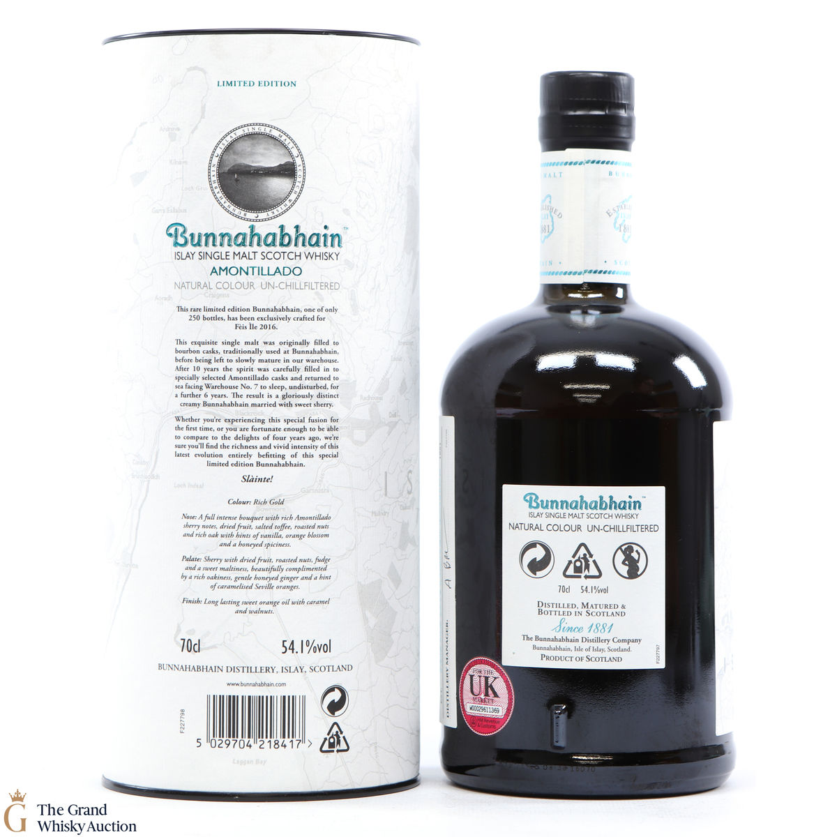 A 16-Year-Old Bunnahabhain exclusively sold at the distillery during Feis Ile 2016. Matured in Bourbon casks for 10 years then finished in Amontillado casks for six years. This is a very limited one of only 250 bottles.