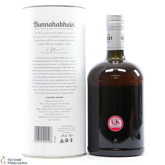 This limited edition single malt from Bunnahabhain Distillery was matured for 14 years in classic bourbon barrels, then finished in Maderia casks for another three years. Bottled at 53%, and released by Bunnahabhain for the 25th anniversary of Fèis Ìle - Fèis Ìle 2020. This is one of only 1164 bottles produced.