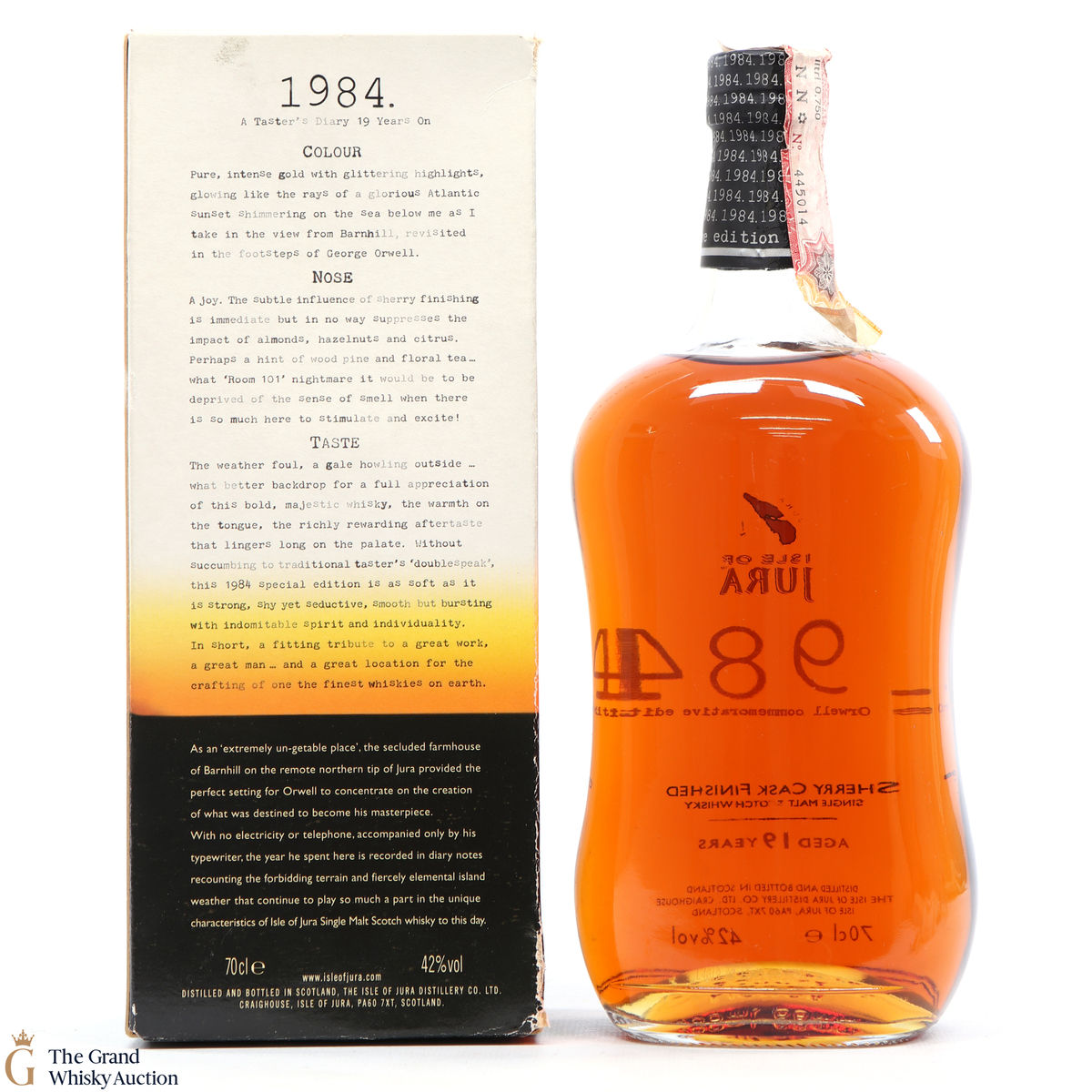 This special edition 19 Year old was released to commemorate the centenary of George Orwell's birth and has been finished in sherry casks. George escaped the pressures of London life for the tranquil isolation of Jura in 1948 to write his vision of the future Nineteen Eighty Four.