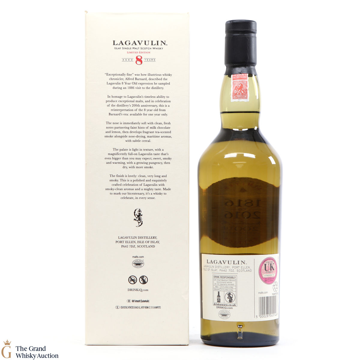 This 8 year old was released in 2016 to commemorate the 200th anniversary of the founding of Lagavulin distillery by John Johnston in 1816. This single malt is smoky, with underlying sweet spice. It was inspired by the visit of Alfred Barnard to the distillery in the 1880s when he tried an 'exceptionally fine' eight-year-old from the distillery, making this a very fitting tribute for the milestone occasion.