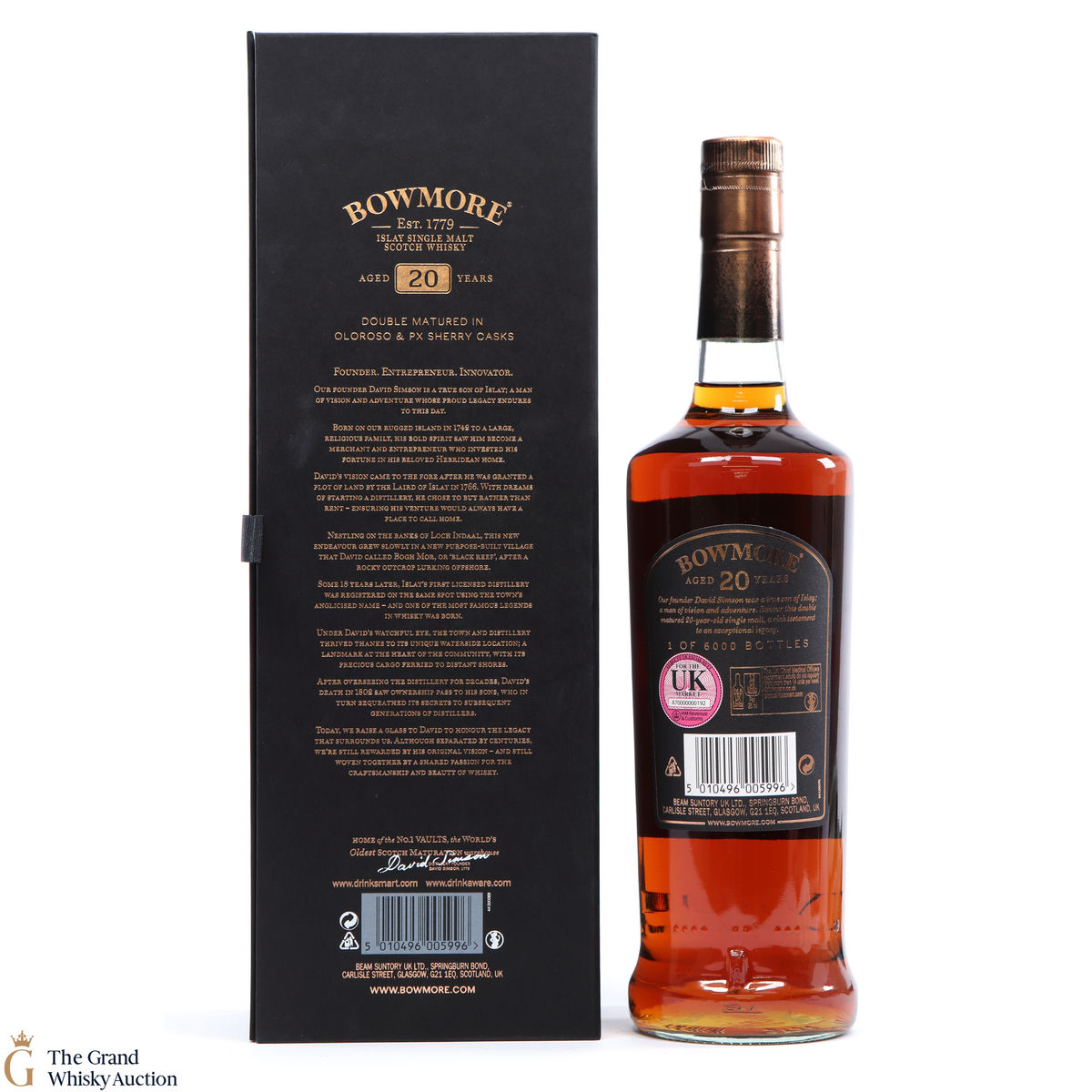 This 20-year-old celebrates and is a testament to the founder of Bowmore. This dram has gone through a double maturation period of 15 years in Oloroso Sherry Butts followed by 5 years in a first fill PX Butts. One of only 6000 bottles.