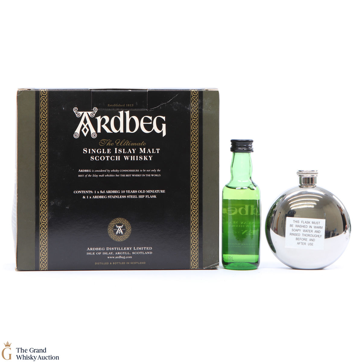 This gift set includes a 5cl bottling of Ardbeg 10 Year Old and Ardbeg Hip Flask.