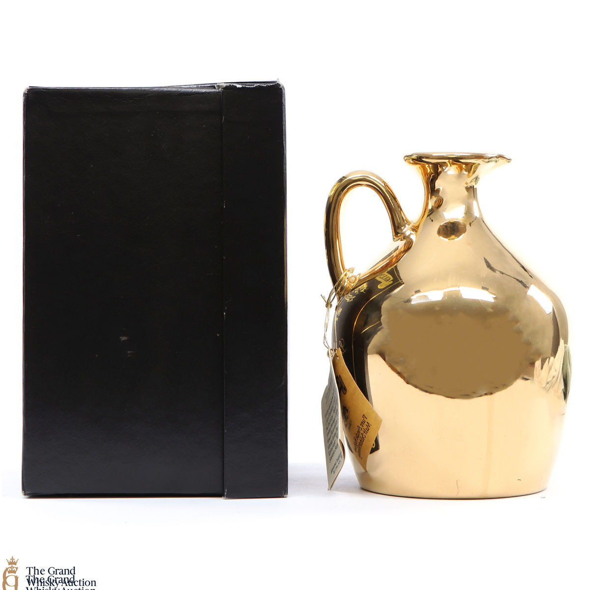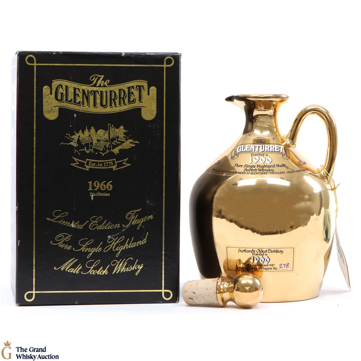 This is a handsome, old release of 1966 vintage Glenturret whisky, presented in a Gold ceramic flagon. This single malt was distilled in 1966 and bottled in 1987 to this gold coloured flagon making the whisky inside at least 20 years old. This is an individually numbered bottle.