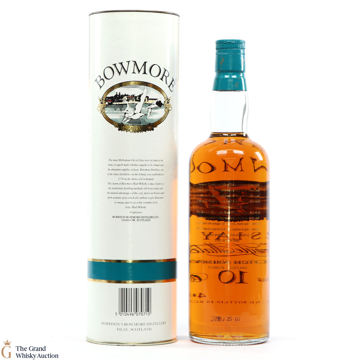 This striking older-style presentation of Bowmore 10 Year Old single malt from the now highly sought screened label bottlings that were released between 1990 and 1995.
