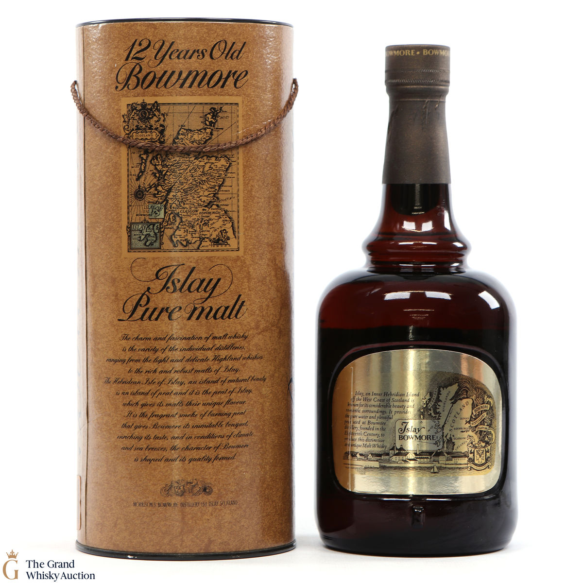 This is an iconic old dumpy style 75cl bottle of Bowmore 12-year-old Bowmore estimated to be from the 1980s. It was bottled when the distillery was Morrison's Bowmore before it was bought over by Suntory in 1989.