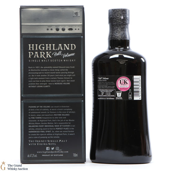 Full Volume by Highland Park was distilled in 1999 and bottled in 2017 from 481 casks. The single malt was matured exclusively in first-fill bourbon casks and was bottled at 47.2% ABV and comes presented in a themed presentation box resembling speaker.