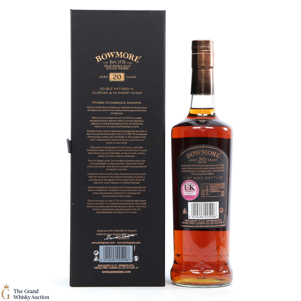 This 20-year-old celebrates and is a testament to the founder of Bowmore. This dram has gone through a double maturation period of 15 years in Oloroso Sherry Butts followed by 5 years in a first fill PX Butts. One of only 6000 bottles.