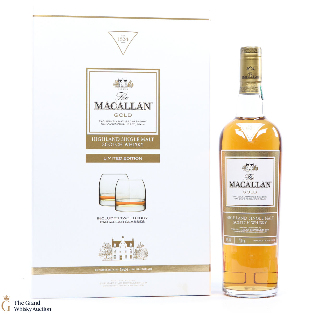 A stylish Macallan gift pack. It contains a 70cl bottle of the Gold expression from the Macallan 1824 Series, and two limited-edition branded Macallan whisky tumblers.