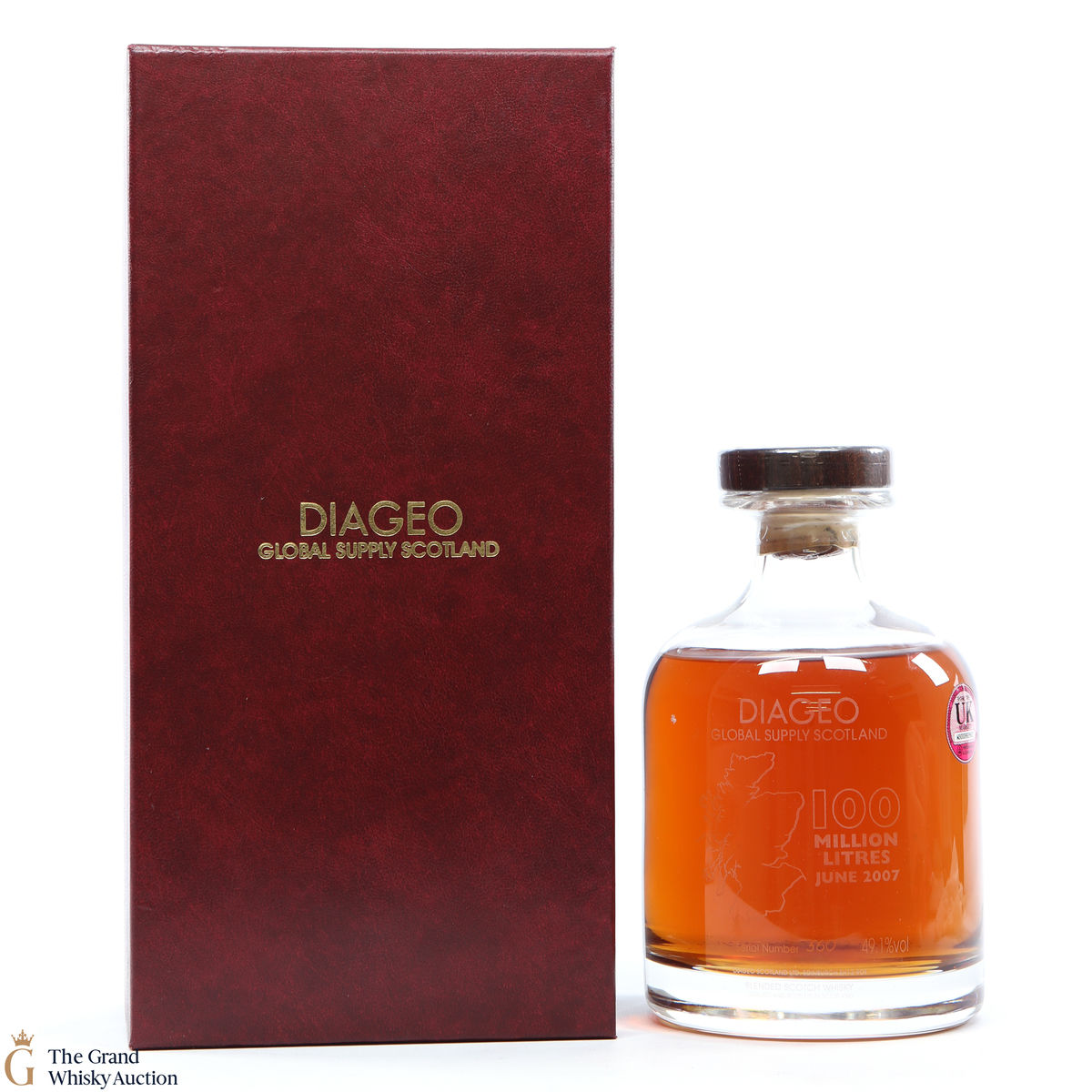 A nicely presented and rare blended whisky decanter produced in 2007 to commemorate Diageo's production of 100 million litres of whisky that year.