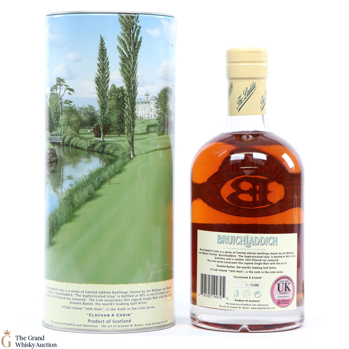 K Club Ireland ''16th Hole'" is the sixth release in Bruichladdich Links collection. The label and the presentation tube of this 14-year-old single malt depict the art of the very talented Graeme Baxter. This is one of 12,000 individually numbered bottles.