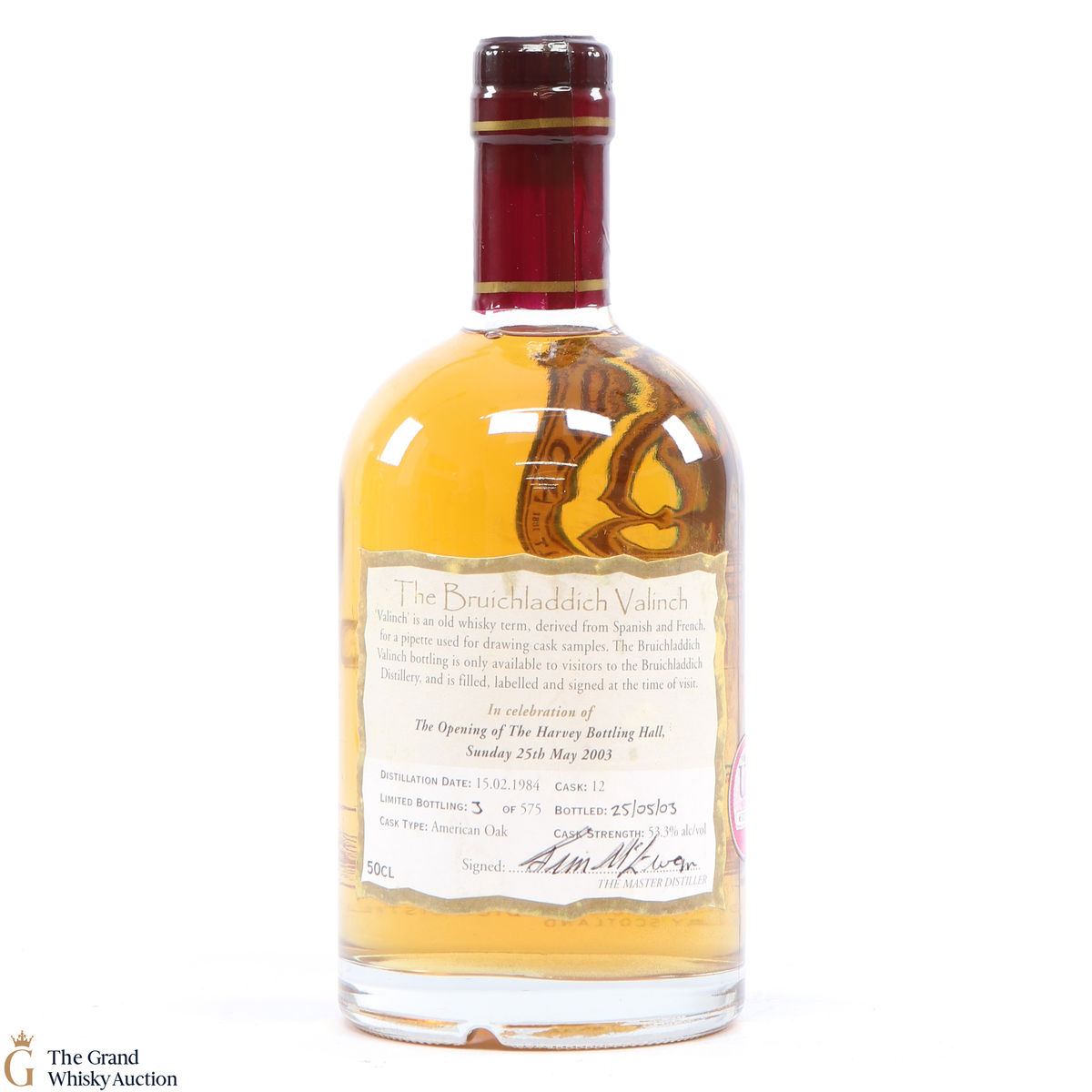 This bottling from Bruichladdich was distilled in 1984 and bottled from a single American Oak cask #12. It was originally only available at Bruichladdich Distillery, released in celebration of the opening of The Harvey Bottling Hall on Sunday 25h of May 2003. This is one of only 575 bottles. This is a 50cl bottling.