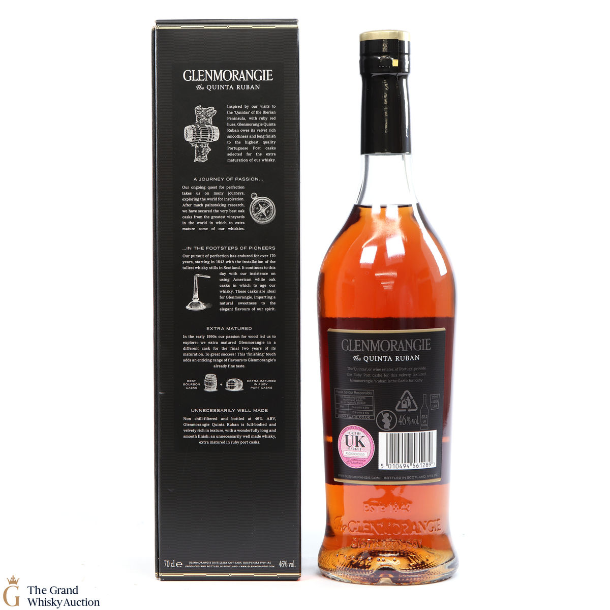 Glenmorangie Quinta Ruban is matured in bourbon casks before finishing in the finest Ruby Port casks from the "Quintas" or wine estates of Portugal. Ruban is Gaelic for Ruby.