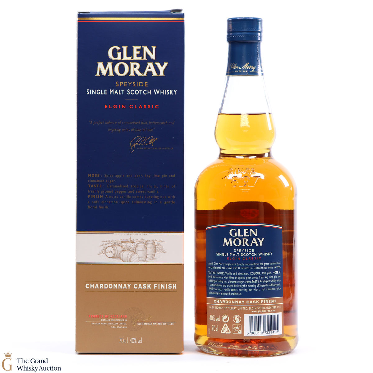 This Glen Moray single malt from Speyside has been matured in oak casks and was finished in Chardonnay Casks. This is an older bottling of Glen Moray that has long been discontinued. It has a light gold colour and is gently spiced with fruity butterscotch notes.