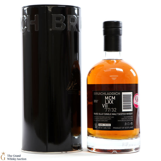 This limited release was made with specially selected casks of Bruichladdich 1977 vintage, the single malt had been aged 32 years when bottled. This release is the 2nd in the Bruichladdich DNA series. Only 844 were released. Bottled September 2010 at the cask strength of 47.4% t