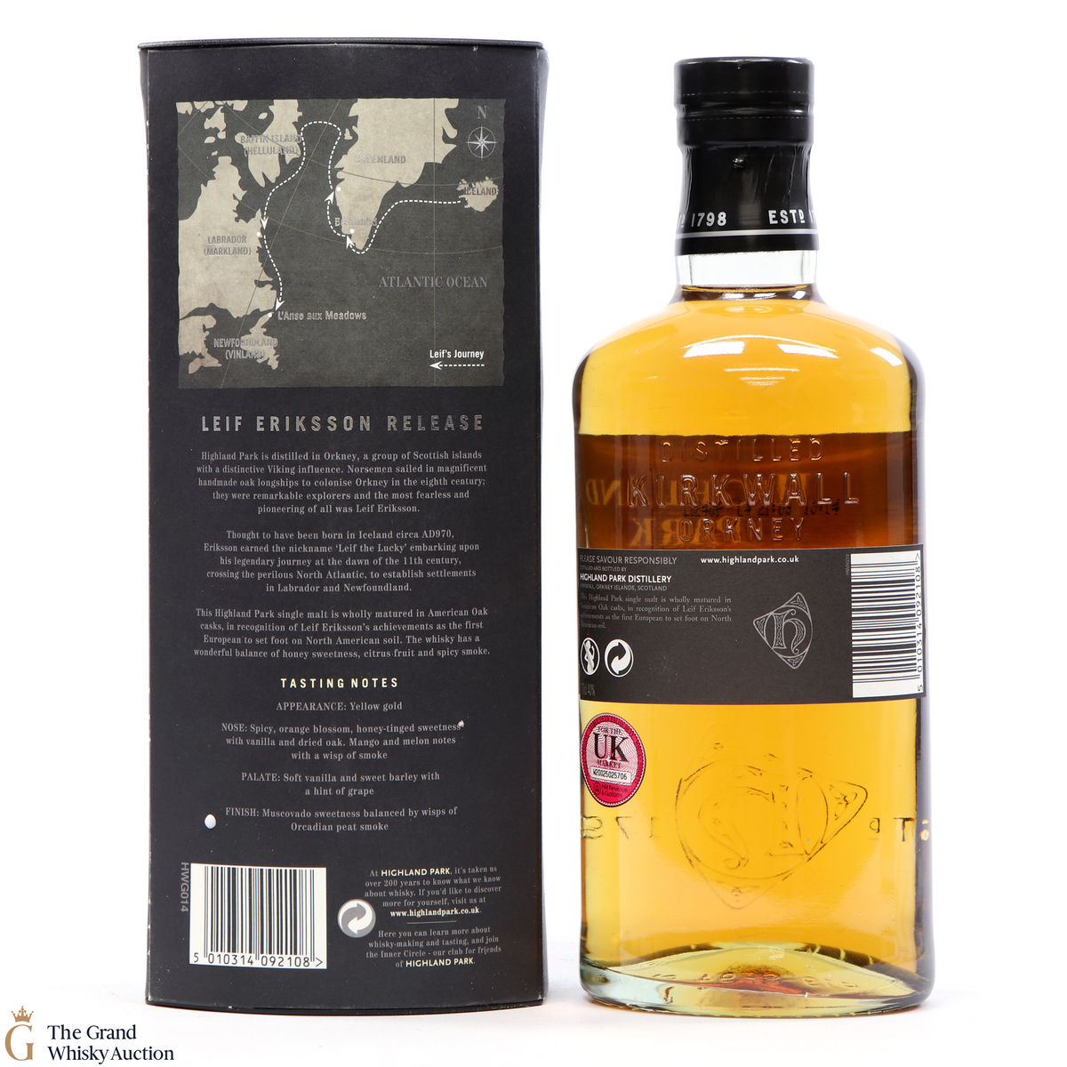 Launched in March 2010, for the travel retail market, Highland Park Leif Eriksson Limited Edition was released to celebrate the first European to reach America over a thousand years ago. The single malt was matured in American oak casks, both ex-bourbon and ex-sherry in recognition of Leif Eriksson, a pioneering Viking explorer, as the first European man to set foot on American soil.