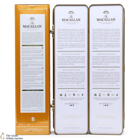 Macallan - 2 x Gold (Limited Edition Tin): Macallan Gold was released in late 2012 as part of a series of colour-themed bottlings introduced to replace the distillery's age-statement expressions. Produced from 9-15yo first fill and refill sherry casks, it was designed to sit between the now-defunct 10 Year Old Sherry Oak and 10 Year Old Fine Oak bottlings. This is a limited edition that comes in a tin presentation box. 40%, 70cl.