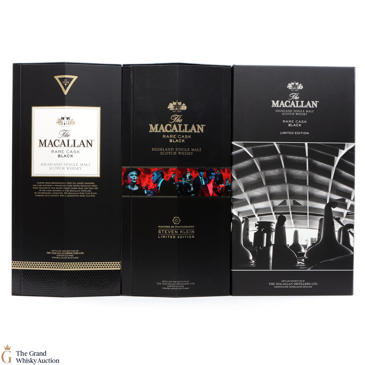 Macallan - Rare Cask Black - Limited Edition: 70cl, 48%: The Macallan Rare Cask Black Limited Edition was released to celebrate the opening of the new Macallan Distillery. It is part of the Macallan 1824 series and features stunning photography by Paolo Pellegrin and a bespoke flask from the Distillery Visitor Centre. The release was a limited edition of 7000 sets, which were only available at airports.