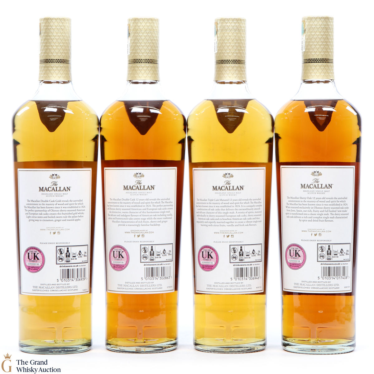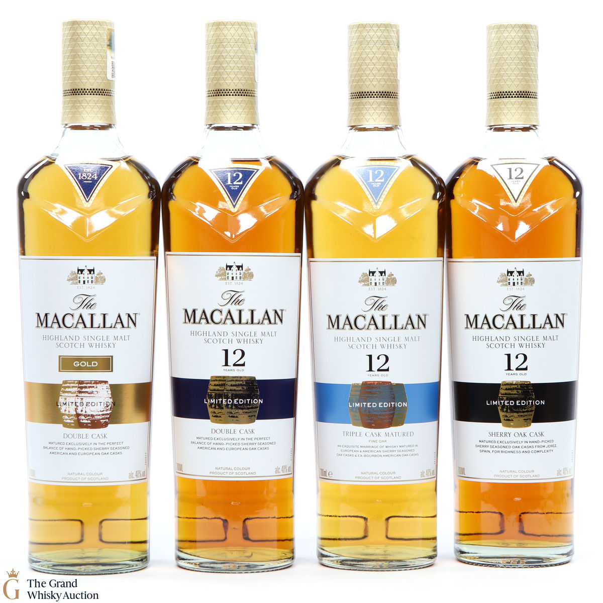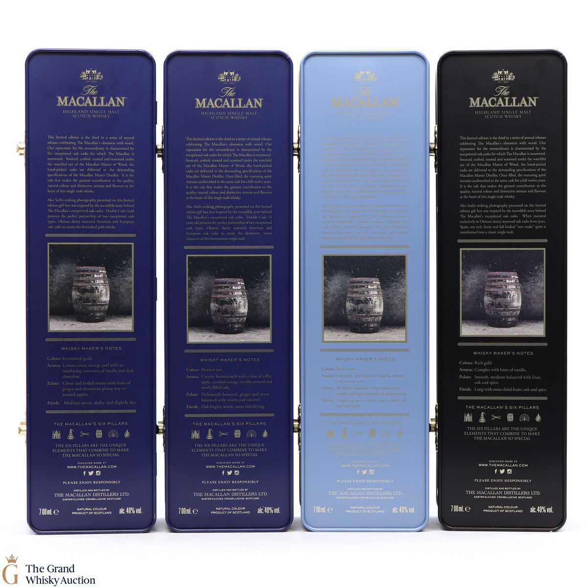 Macallan - Gold (Limited Edition Tin): 40%, 70cl: Macallan Gold was released in late 2012 as part of a series of colour-themed bottlings introduced to replace the distillery's age-statement expressions. Produced from 9-15yo first fill and refill sherry casks, it was designed to sit between the now-defunct 10yo Sherry Oak and 10yo Fine Oak bottlings. This is a limited edition that comes in a tin presentation box.