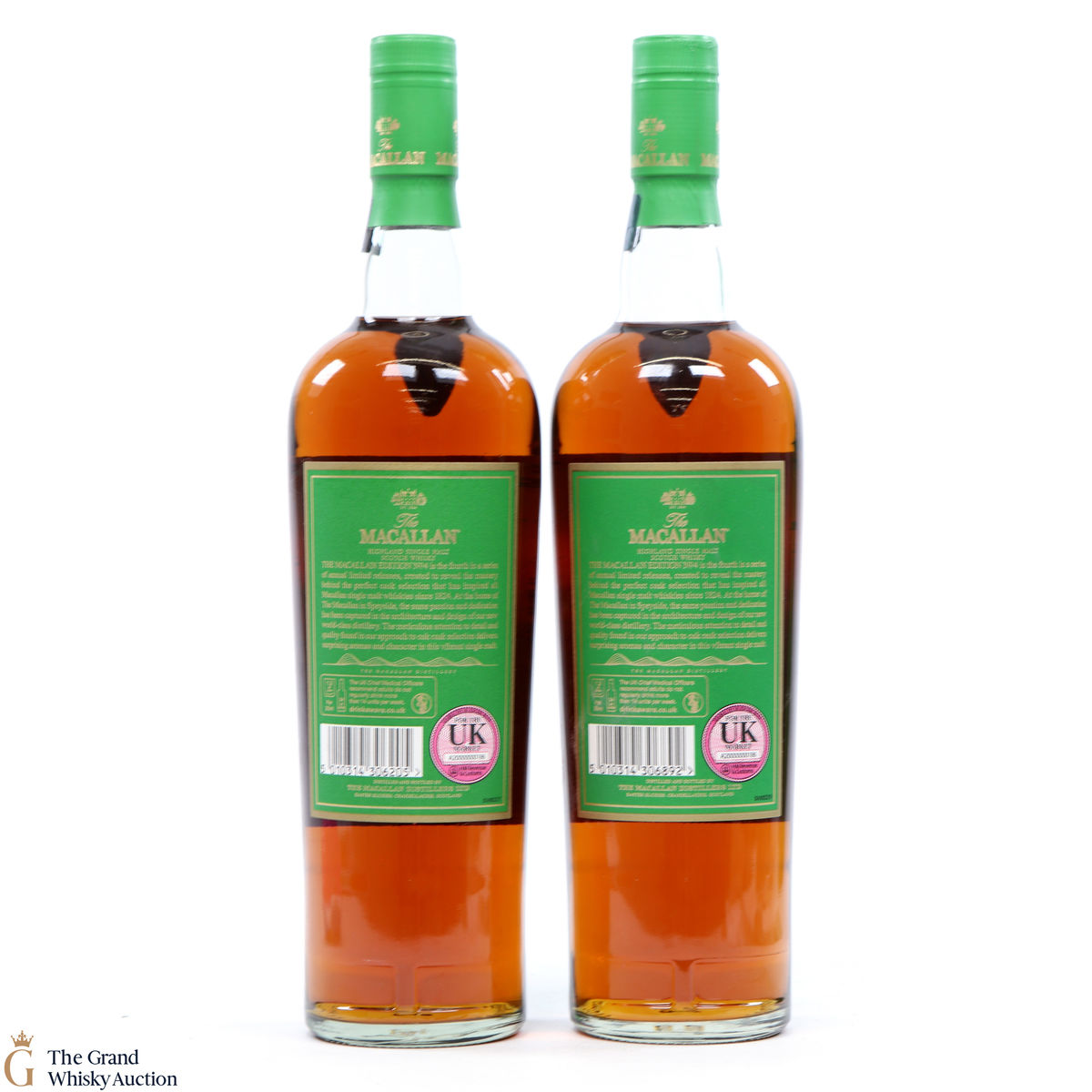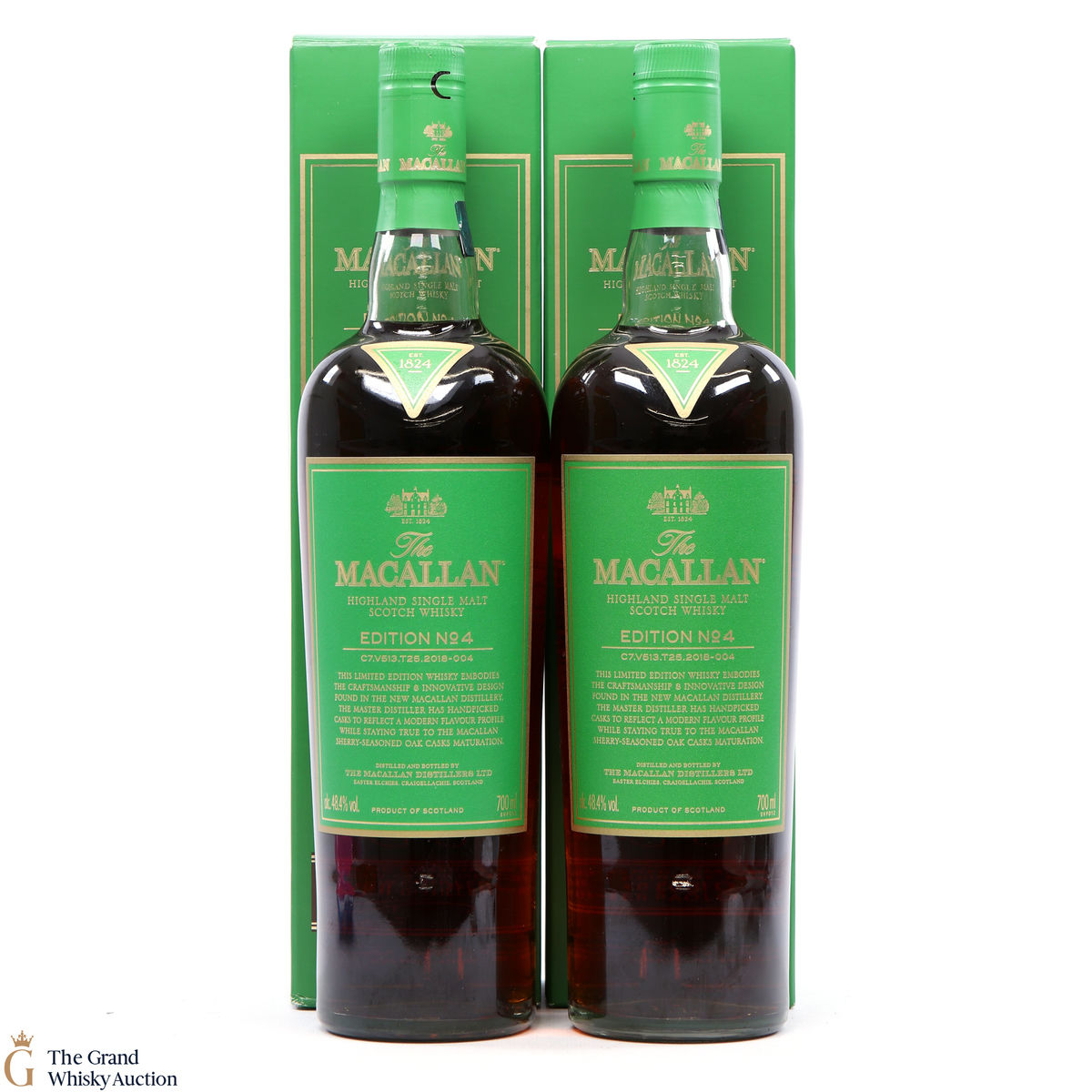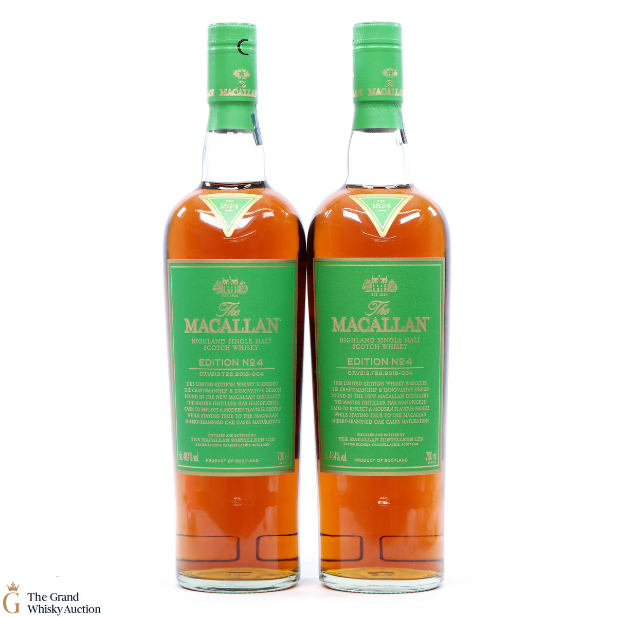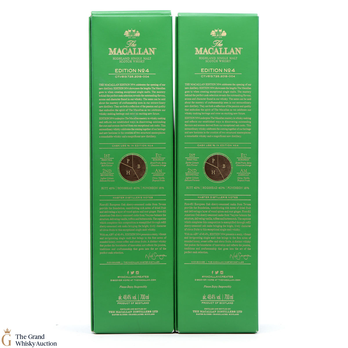 Macallan - Edition No4 - Edrington & Maxxium Staff: 70cl, 48.4%. The fourth release in the Edition Series from The Macallan, this Speyside single malt is a celebration of the distillery's whisky-making heritage, combining a unique selection of oak cask styles. Edition No.4 reflects the craftsmanship and pioneering design of the new Macallan distillery.