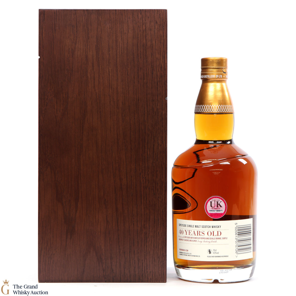 Due to the various ages of bottles and their seals, the condition of liquid is at the buyer's discretion and no claim can be lodged against failure/leakage in transit. Loss and breakage cover is available at 3% of the hammer price as standard. If the lot is not insured, no claim can be lodged against the courier or The Grand Whisky Auction for breakage or loss in transit.