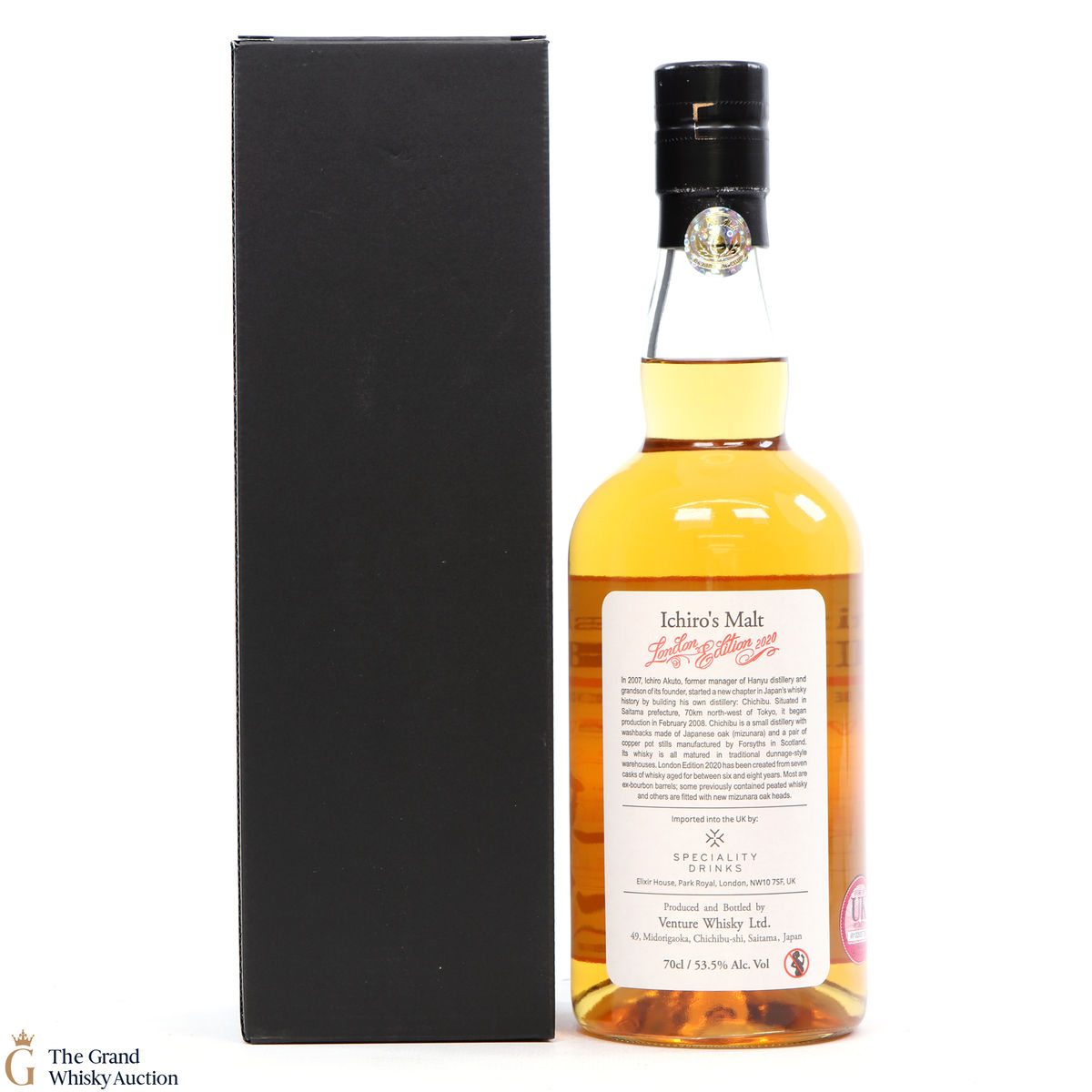 One of just 1736 bottles of the highlight sought after limited-edition Chichibu London (2020) bottlings from the Chichibu Distillery in Japan. Aged for six to eight years and vatted from a total of seven casks including some ex-bourbon barrels previously used to mature peated whisky and casks with new, mizunara-oak ends. Bottled at the cask strength of 53.5% ABV.