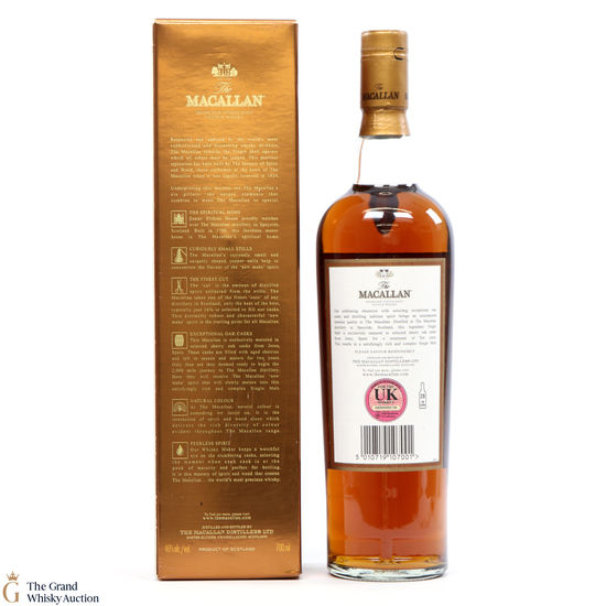 A 10 year old single malt from The Macallan Distillery. It has been exclusively matured in selected sherry oak casks from Jerez, Spain.