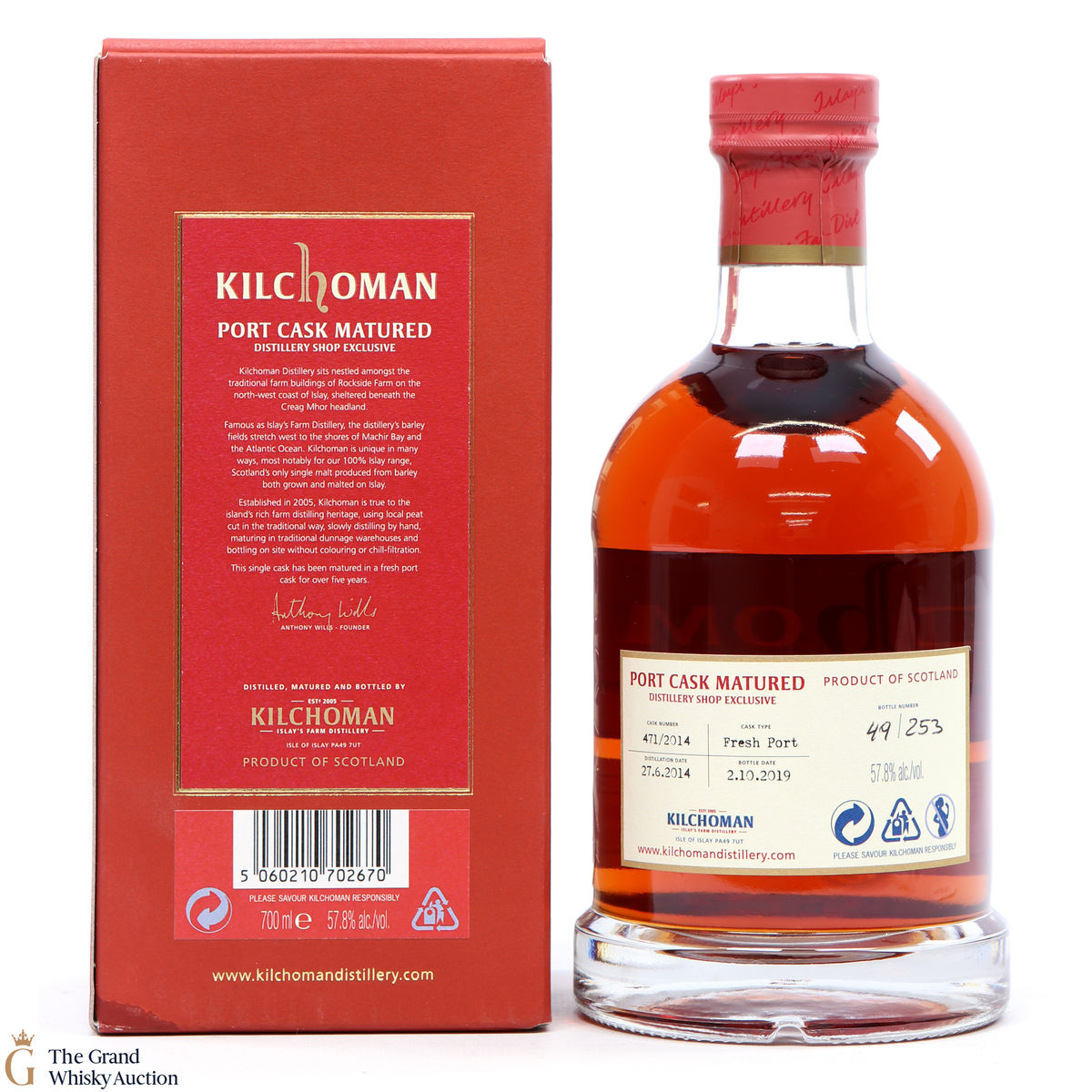 This 2014 port-cask-matured single malt by Kilchoman was released in 2019. Matured in fresh port cask 471/2014 and was bottled in October 2019. This bottling was exclusively available at the distillery shop.