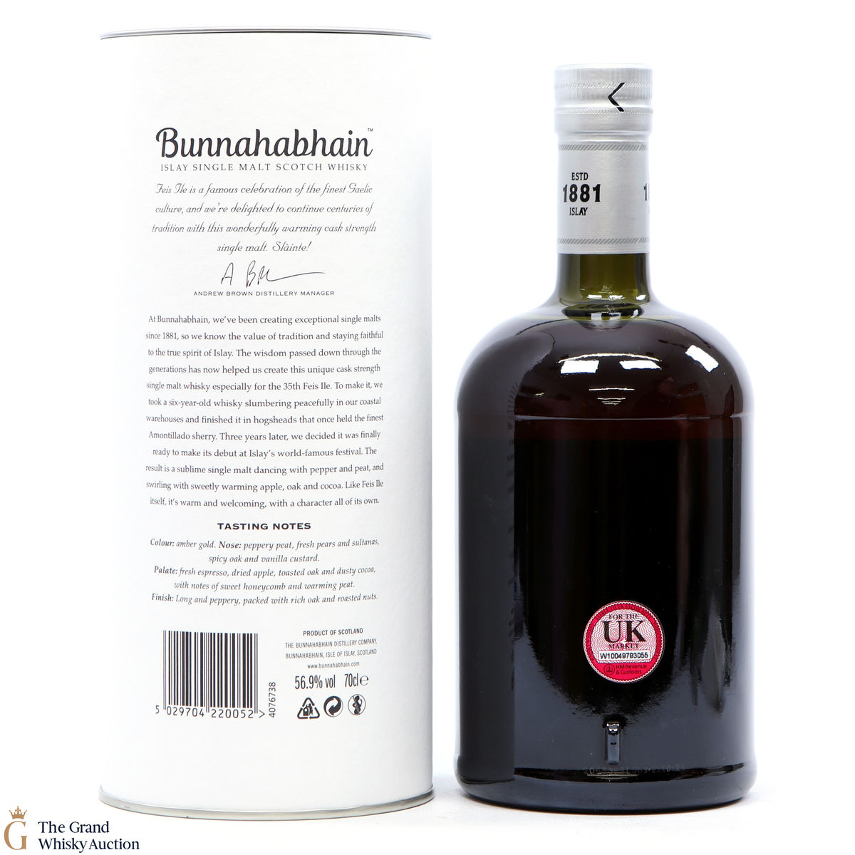 This limited edition single malt from Bunnahabhain Distillery was matured for 6 years in classic bourbon barrels, after which the single malt was transferred to Amontillado sherry Hogsheads for another three years. It was bottled at 56.9% and was released by Bunnahabhain for Fèis Ìle 2020. This is one of only 1658 bottles produced.